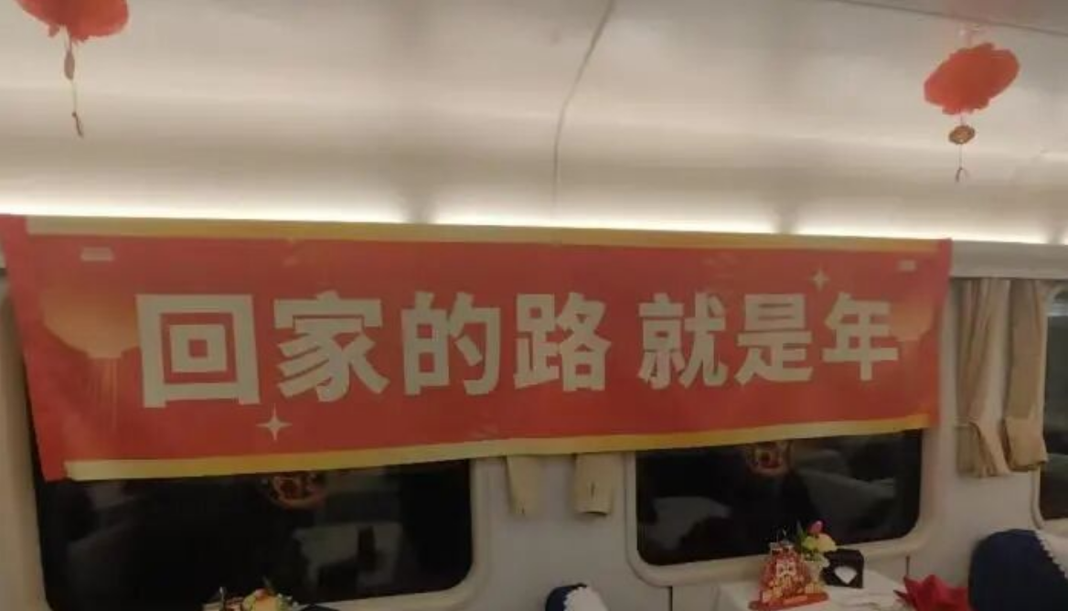 记者在现场看到,作为北京的“春运首发列车”,K4069次列车的车厢内挂有灯笼,张贴着春联,并悬挂着“回家的路就是年”横幅。