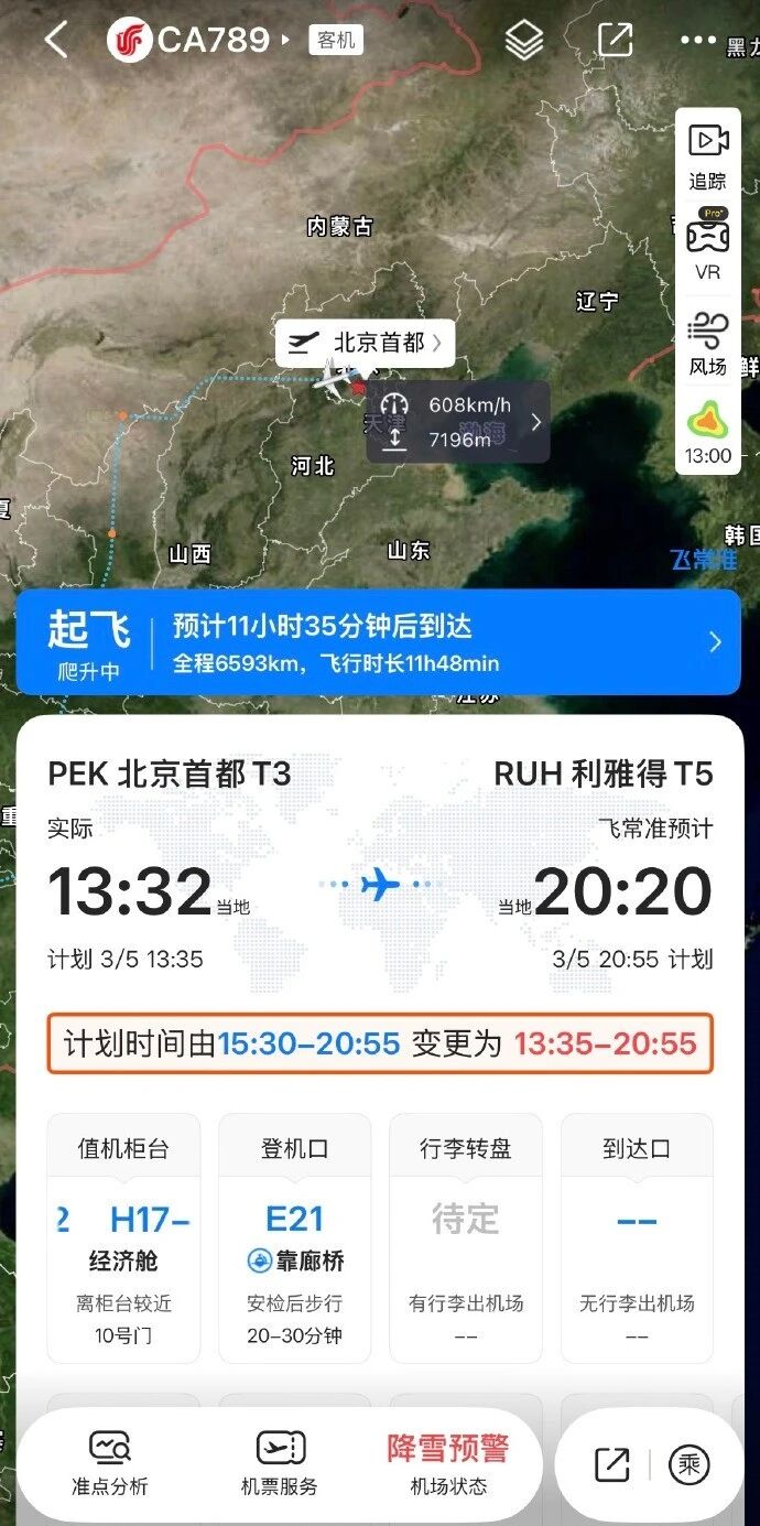 飞常准APP显示,国航北京—利雅得CA789航班已于北京时间3月5日13:32从北京首都机场起飞。该航班是受中东地区局势影响后,中国航司飞往中东地区的首个航班。